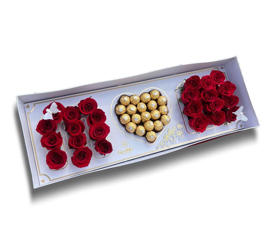 Mom box with roses and Ferrero Rocher, the color of the box may change depending on availability (black or white) the roses also sell out quickly due to the high demand for Mother's Day