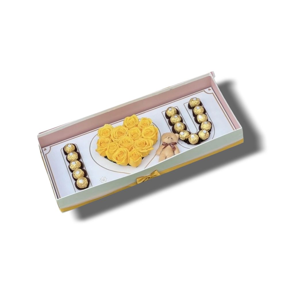I love You box with roses and chocolates. The box can be white, pink or black depending on availability.
